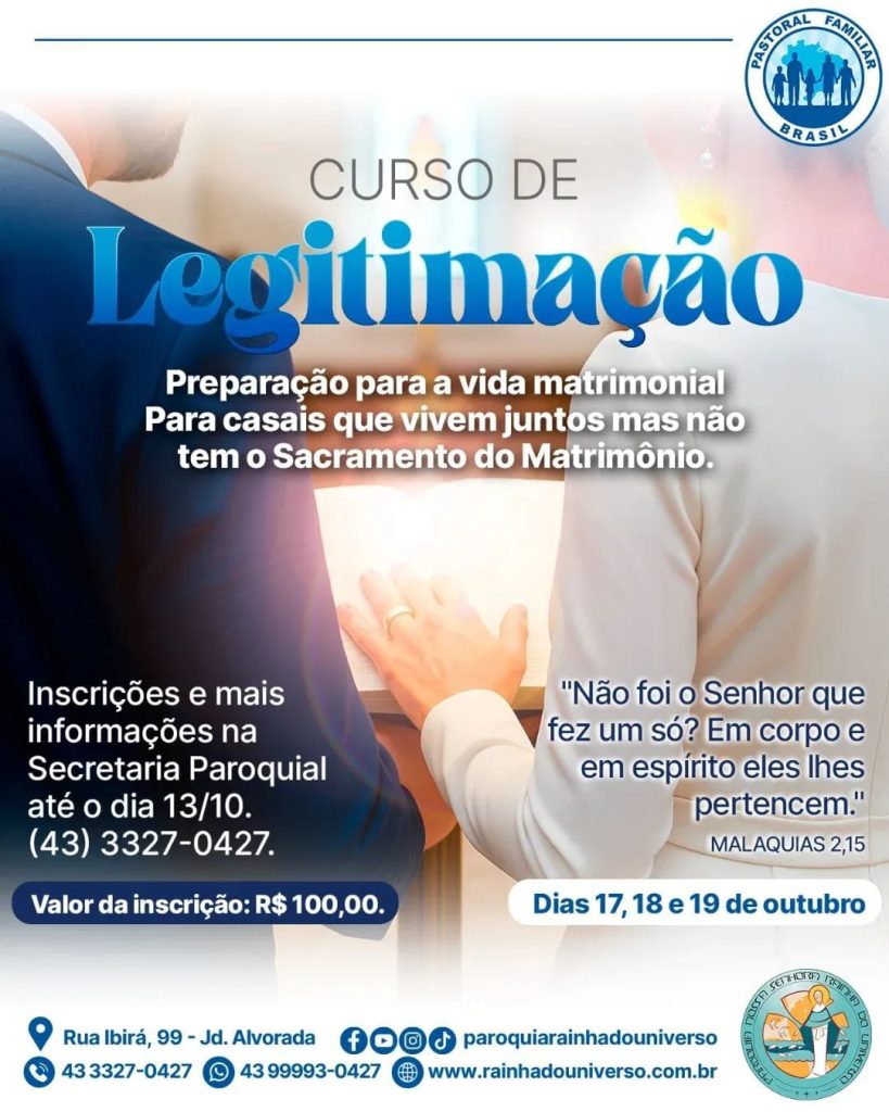Queridas famílias, a Paróquia Nossa Senhora Rainha do Universo, por meio da Pastoral Familiar, realizará nos dias 17, 18 e 19 de outubro o Encontro de Legitimação para o Sacramento do Matrimônio.