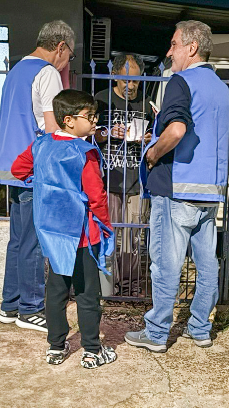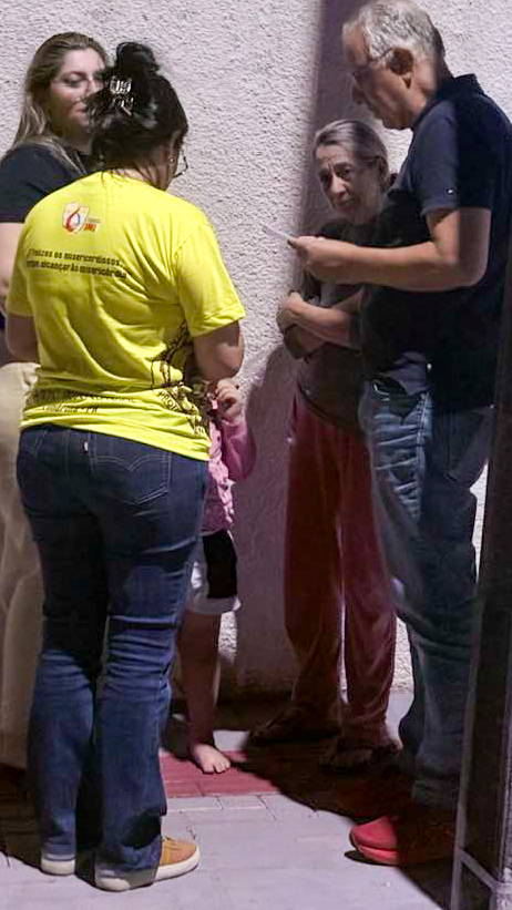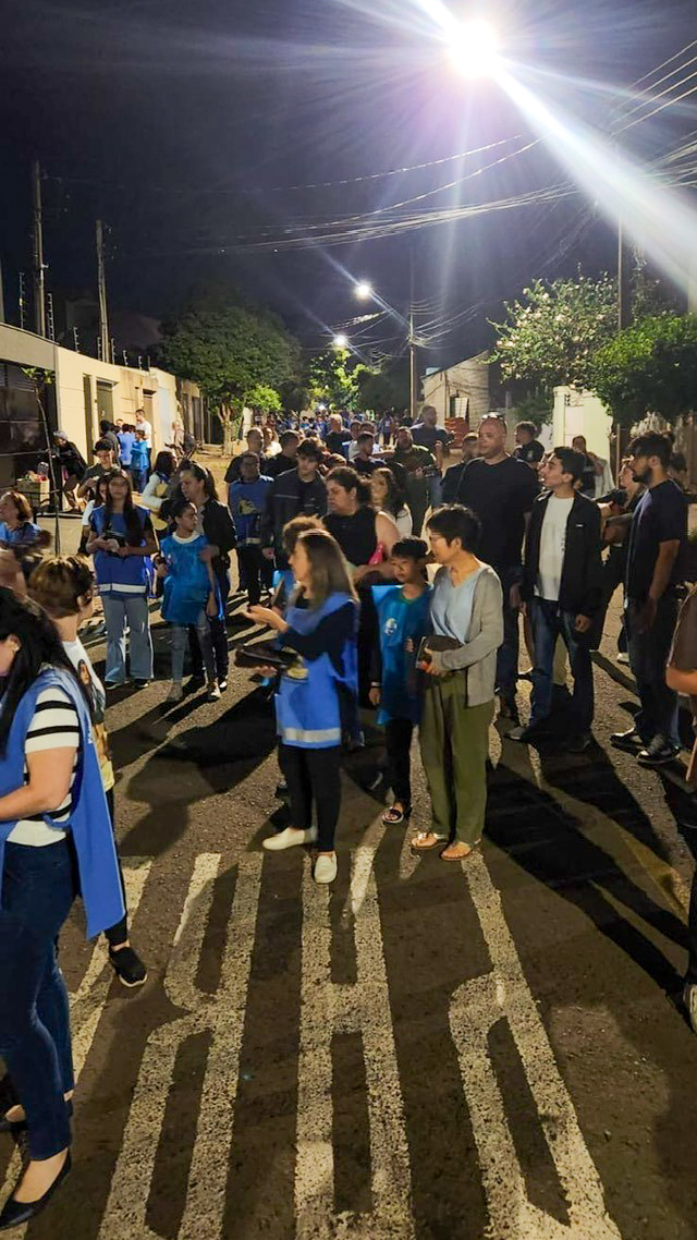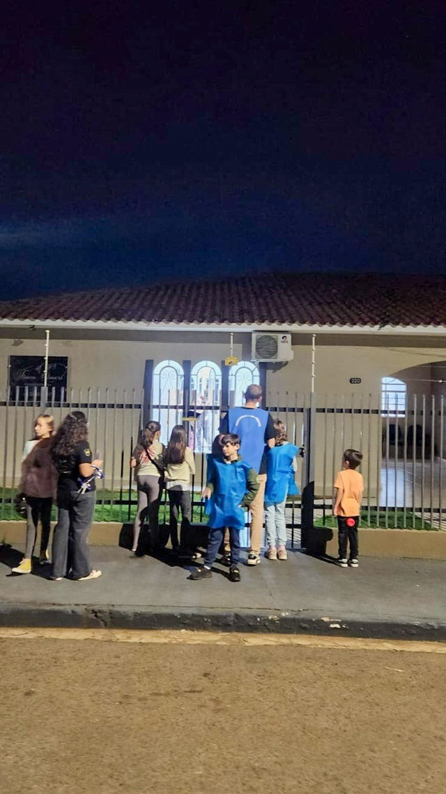 Enquanto os missionários batiam às portas, um grupo de cantores e tocadores caminhava pelas ruas entoando louvores a Deus, enchendo o bairro de alegria, fé e esperança.