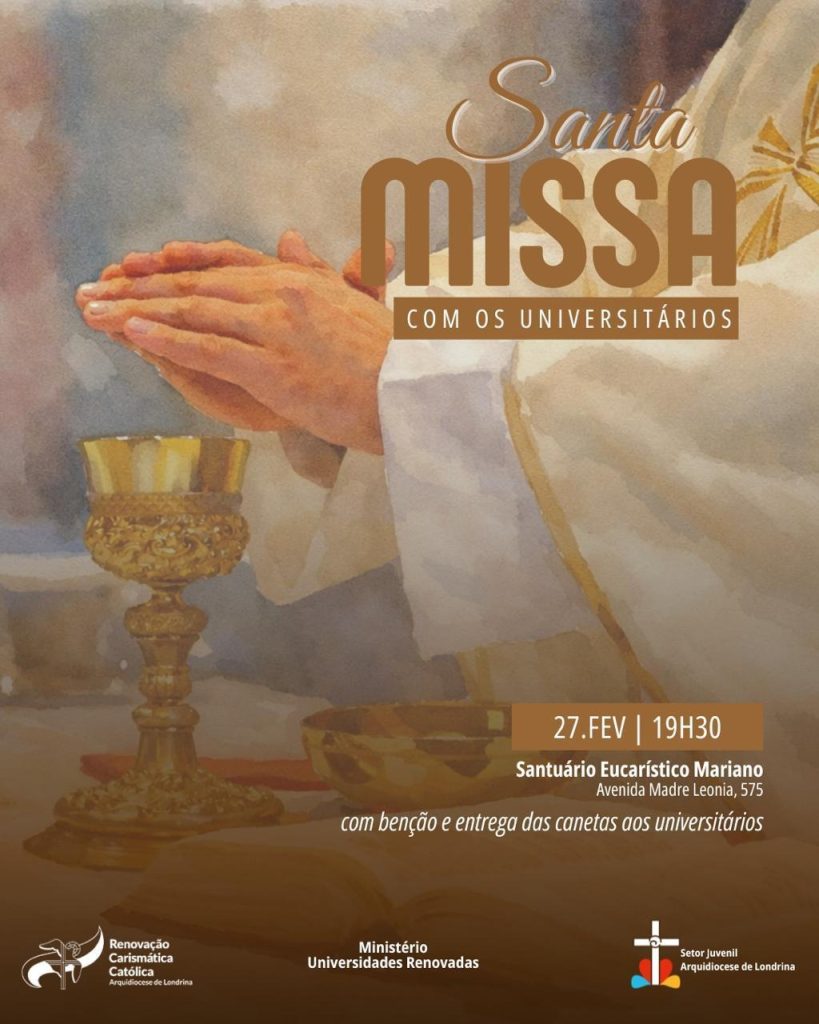 Todos os jovens universitários da Arquidiocese de Londrina estão convidados para a Missa que será realizada hoje, sexta feira, 27/02, às 19h30 no Santuário Eucarístico Mariano em Londrina – PR.