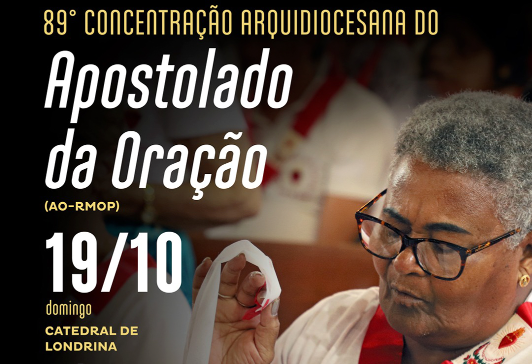 O Apostolado da Oração da Arquidiocese de Londrina convida para a concentração arquidiocesana anual, no dia 19 de outubro, na Catedral. O evento será assessorado pelo padre Eliomar Ribeiro, SJ, diretor nacional do Apostolado da Oração. A concentração inicia às 13h30 e encerra com a Santa Missa às 16h.
