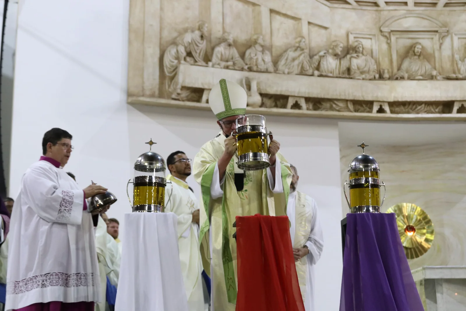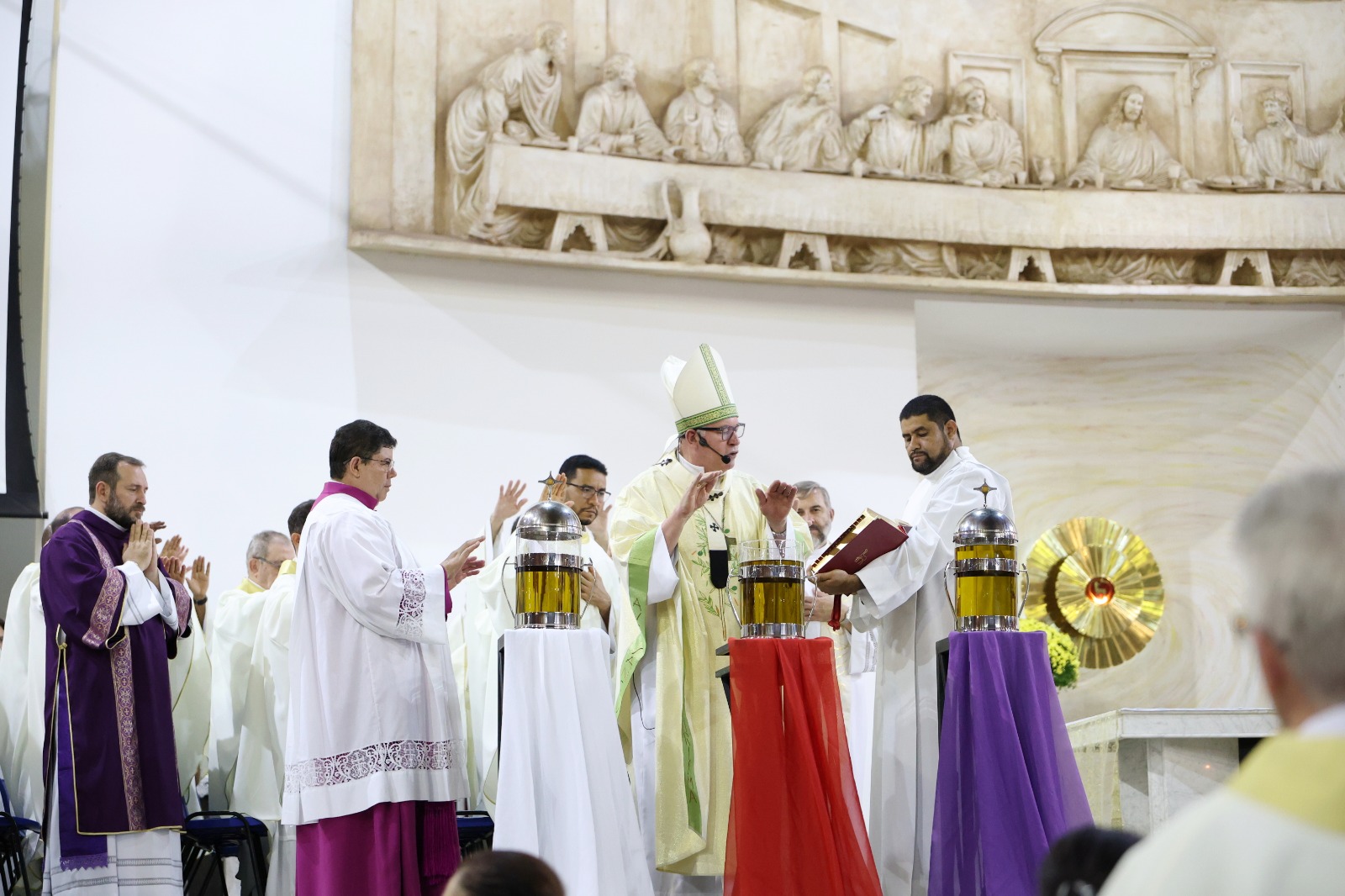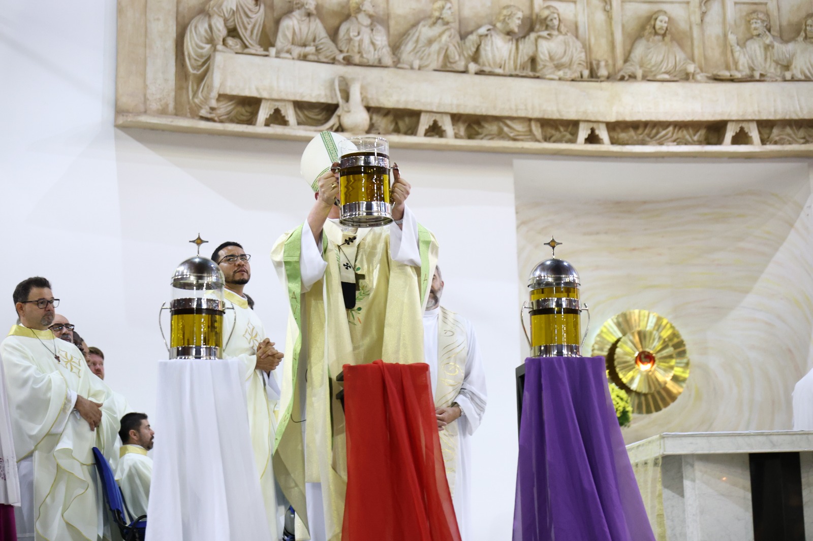 Durante a celebração, foram abençoados e consagrado os óleos que acompanharão a vida sacramental das paróquias ao longo do ano